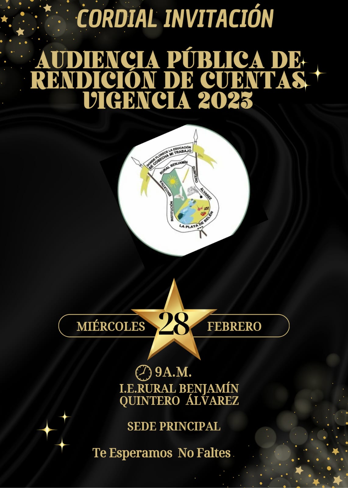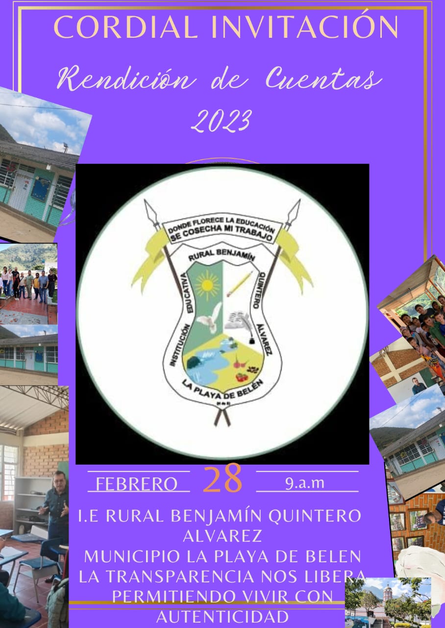 TARJETA DE INVITACIÓN A LA COMUNIDAD EDUCATIVA I. E. R. BENJAMÍN QUINTERO ÁLVAREZ LA PLAYA DE...